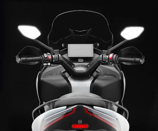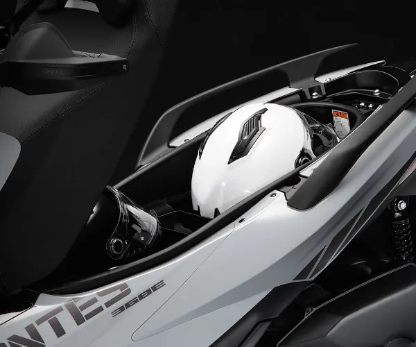 Osim toga, nudi veliki kapacitet za pohranu ispod sjedala s prostorom za dvije integralne kacige i u pretincima za rukavice, zajedno s integriranim USB priključcima, kombinirajući praktičnost, modernu tehnologiju i najveću opremu u svom segmentu: motor s tekućinskim hlađenjem i DOHC glavom s 4 ventila, maksimalna snaga od 38,71 KS, maksimalni okretni moment od 40 Nm pri 6000 o/min, elektroničko ubrizgavanje Bosch MSE 6.0., teleskopska vilica montirana na dvostrukom mostu, prednja kočnica s radijalnom čeljusti s 4 klipa J.Juan, prednji kotač od 15″ i stražnji od 14″, parkirna kočnica, podesive ručice, neovisni dvokanalni ABS sprijeda i straga, elektronička kontrola tlaka i temperature u gumama, kontrola proklizavanja (TCS), dva načina isporuke snage: Eco i Sport, vjetrobran s električnim podešavanjem, Full LED osvjetljenje, digitalni zaslon visoke razlučivosti TFT u boji i Screen Mirroring, grijane ručke, osvijetljene komande, podesivi upravljač u dvije pozicije, pretinac za dvije integralne kacige, tri pretinca za rukavice (jedan s bravom), centralno zaključavanje s elektroničkim ključem na blizinu, tri USB priključka (jedan tip C), predinstalacija za kameru, itd.